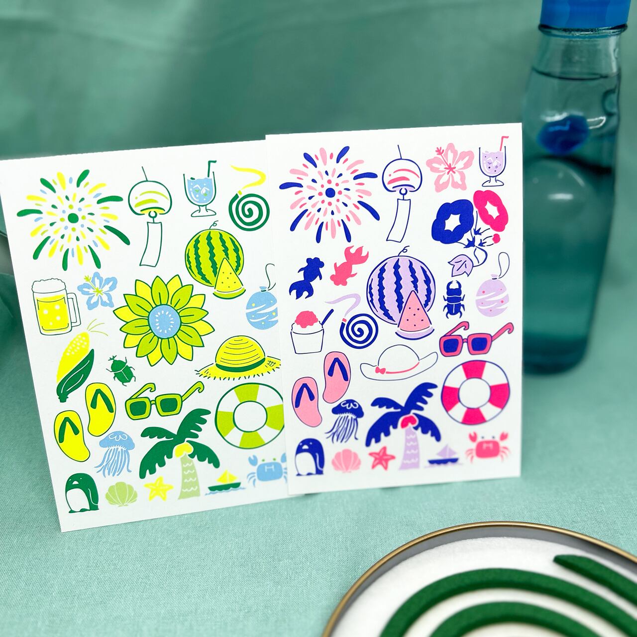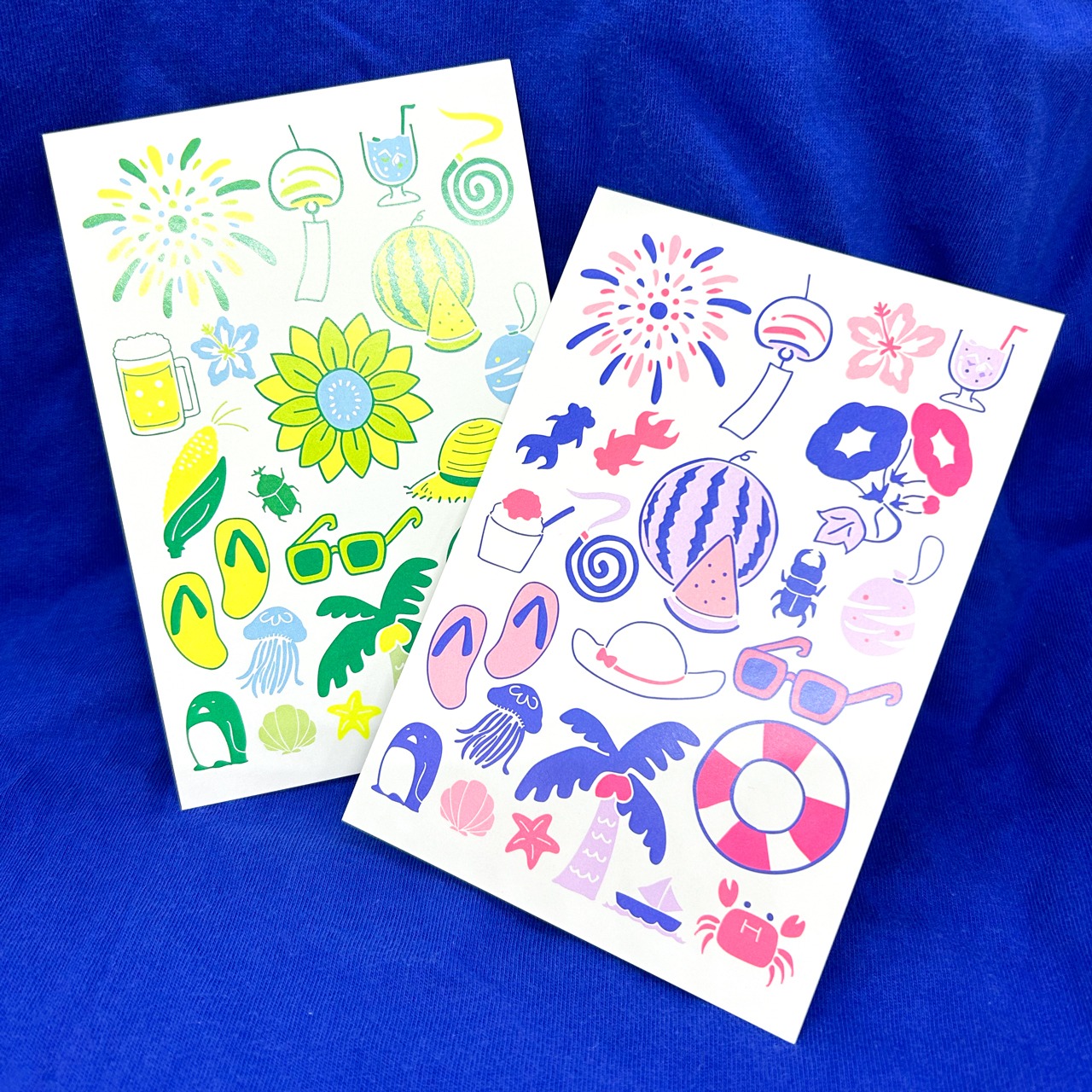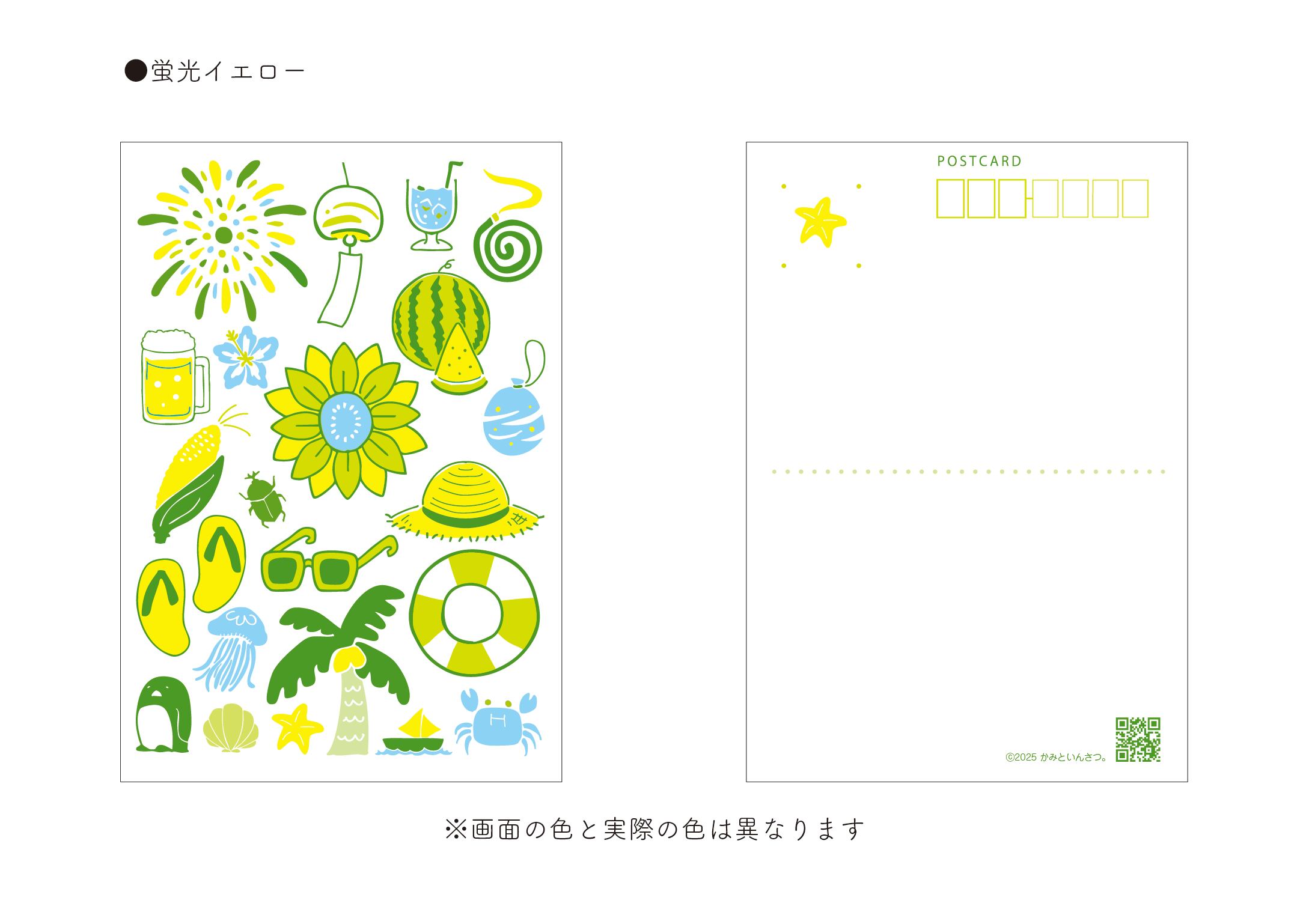 蛍光ピンク、蛍光イエローの特色をそれぞれ使用した夏らしい絵柄のポストカード2枚組です。